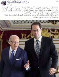 وقال رئيس الحكومة، يوسف الشاهد، إن الرئيس السبسي، “يتلقى حاليا العناية المطلوبة”، ذاكراً على صفحته على موقع فيسبوك، أنه زار “السبسي” الذي يرقد بالمستشفى العسكري بالعاصمة.