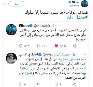 وقالت “إليسا” في تغريدتها : “أرض فلسطين تضيع ببطء ونحن متفرّجون، أي قانون وأي شرع يحوّل هذه الأرض من أرض سلام إلى أرض حروب؟”، فردّ عليها “أدرعي” قائلاً : “نعم حماس مسؤولة عن كل هذا الوضع المؤلم صور المنزل في البلدة الإسرائيلية الذي تعرّض لهجوم حماس الصّاروخي الإرهابي، خير دليل على عدوانية وبشاعة هذه الحركة التي تدفع سُكّان قطاع غزّة نحو المزيد من العنف”.