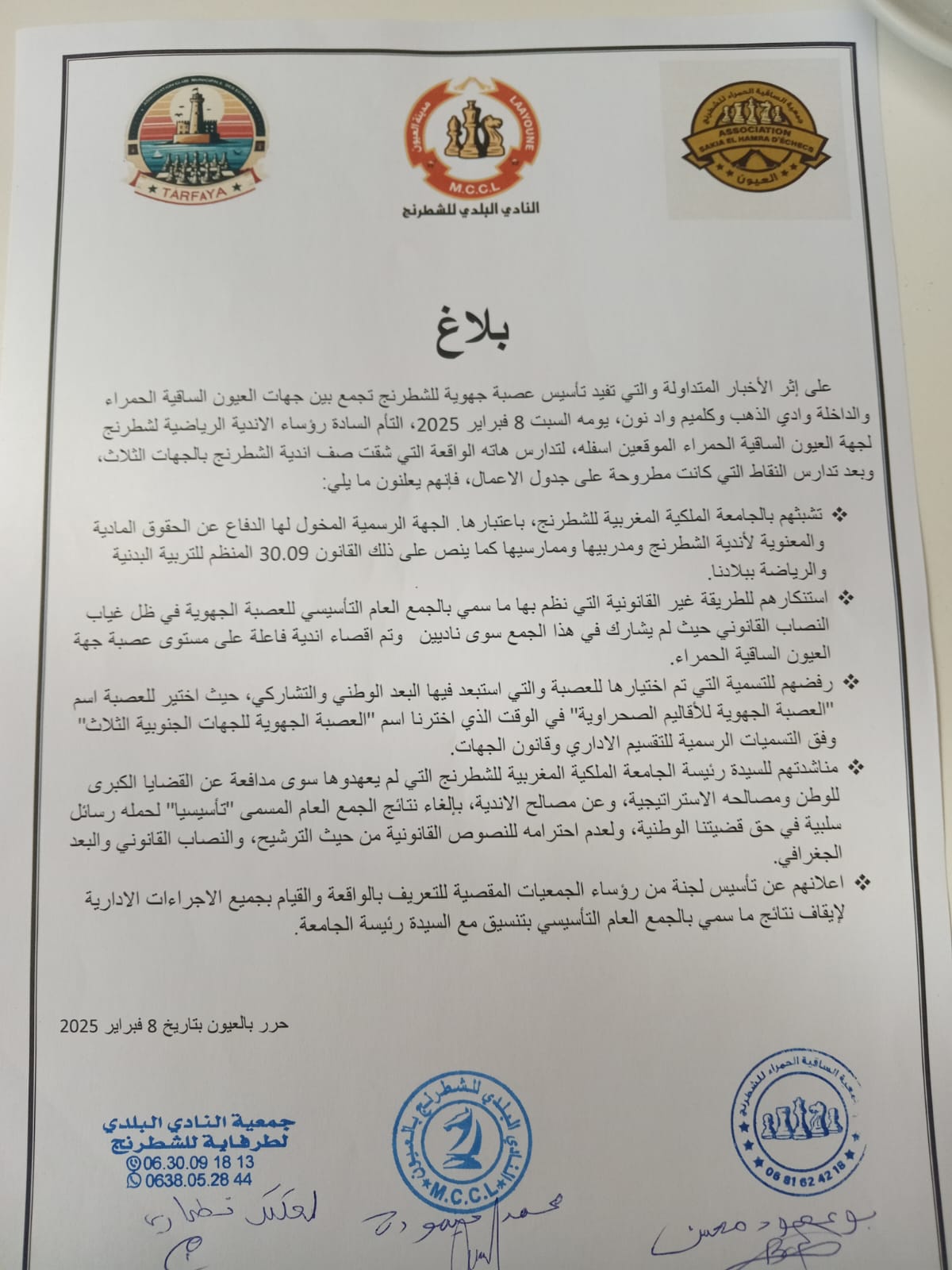 ووجّه رؤساء الأندية نداءً إلى رئيسة الجامعة الملكيّة المغربيّة للشّطرنج، مطالبينها بالتّدخّل العاجل لإلغاء نتائج هذا الجمع العام في إشارة إلى أنّه يُخالف القوانين المعتمدة من حيث التّرشيح، النصاب القانوني، والبعد الجغرافي. وأكّد المجتمعون أنّ الإعتراف بهذه العصبة سيحمل رسائل سلبيّة تمُس بالقضيّة الوطنية وتؤثّر على وحدة الأندية الرّياضيّة في الأقاليم الجنوبيّة للبلاد.