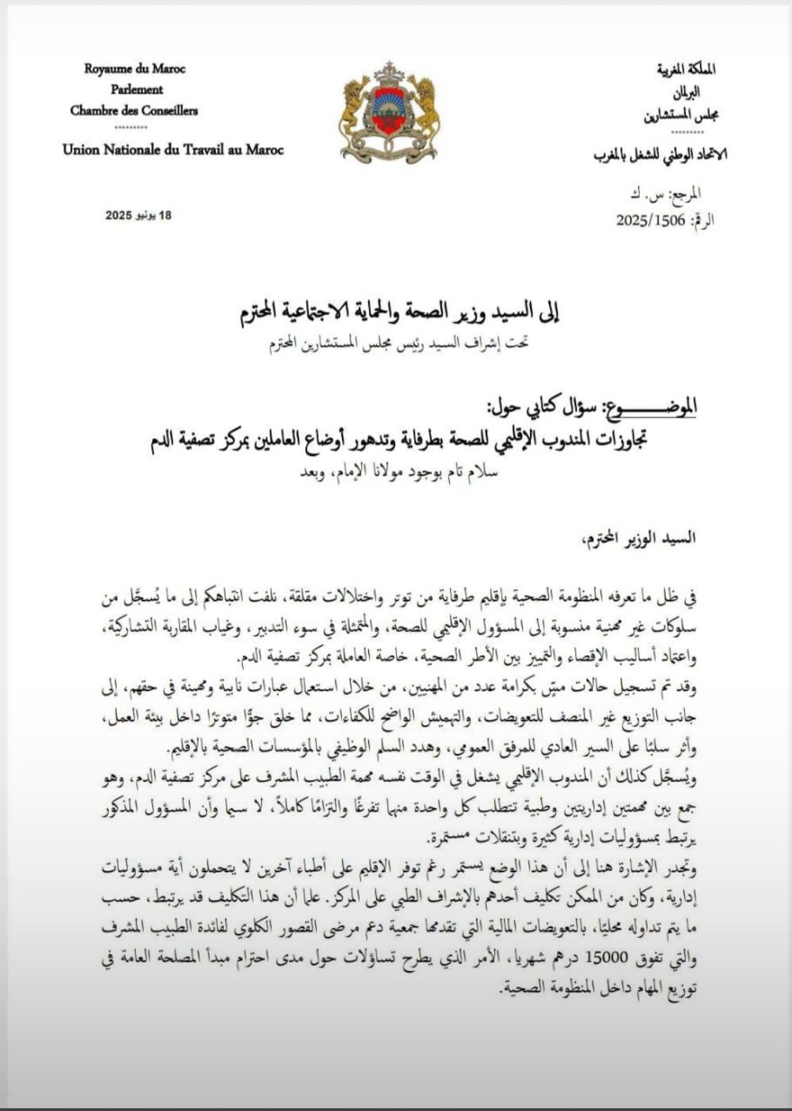 وفي تطوّر لافت، تمّ توجيه سؤال كتابي إلى وزير الصحّة والحماية الاجتماعيّة عبر مجلس المستشارين، يُسلّط الضّوء على ما اعتُبر خرقًا إداريًّا، يتمثّل في جمع المسؤول الإقليمي بين مهمّتيْن حسّاستيْن: مندوب إقليمي وطبيب مشرف على مركز تصفية الدّم، رغم أنّ المنصبيْن يتطلّبان تفرّغًا تامًّا، في حين يتوفّر الإقليم على أطبّاء آخرين دون مسؤوليات إداريّة.