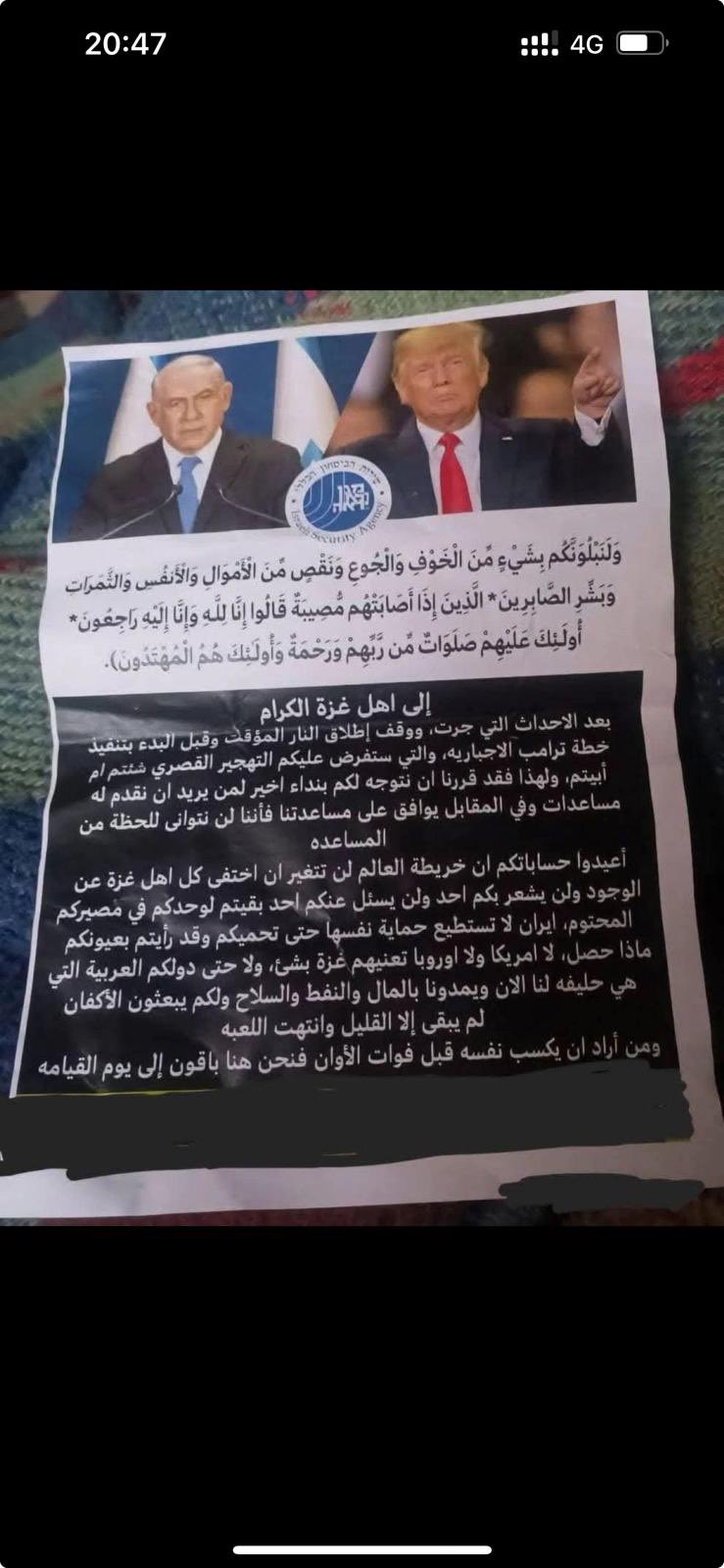 في ظِل التّصعيد العسكري الأخير في غزّة، أقدمت قوّات الإحتلال الإسرائيلي على إلقاء منشورات فوق رؤوس سكّان القطاع، تتضمّن رسائل إستفزازيّة وعنصريّة تهدف إلى تحقيق التّعاون من قِبل المدنيّين في حال رغبتهم بالحصول على مساعدات إنسانيّة أثناء تنفيذ عمليّة التّهجير القسري.