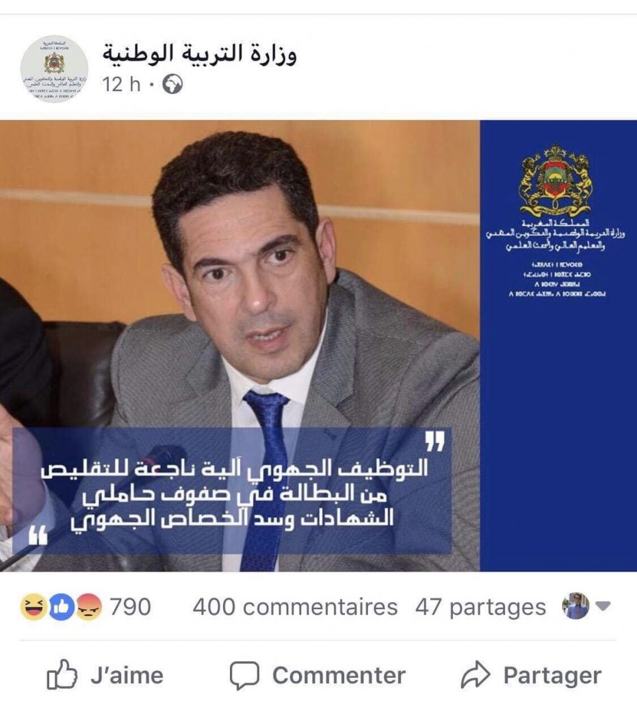 إلى ذلك، يأتي هذا التّصريح، الذي نشرته وزارة “أمزازي” على صفحة الوزارة بموقع التّواصل الإجتماعي “فيسبوك”، عقب اِعلان رئيس الحكومة، اليوم الخميس، عن تمسُّكِ حكومتهِ بالتّوظيف الجهوي للشّباب لدى الأكاديميات التعليميَّة، مُعتبراً بذلك، أنّ “التّعاقد” آلية ناجعة لامتصاص البطالة في صفوف الشّباب.