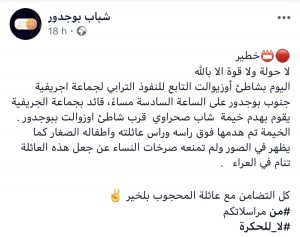 تداول رواد مواقع التواصل الاجتماعي بمدينة بوجدور، منشورات مرفوقة بصورٍ و مقاطع فيديو، تظهر عملية هدم خيمة أحد الشاب ذوي الاحتياجات الخاصة، من لدن من يعتقد أنه أحد رجال السلطة.