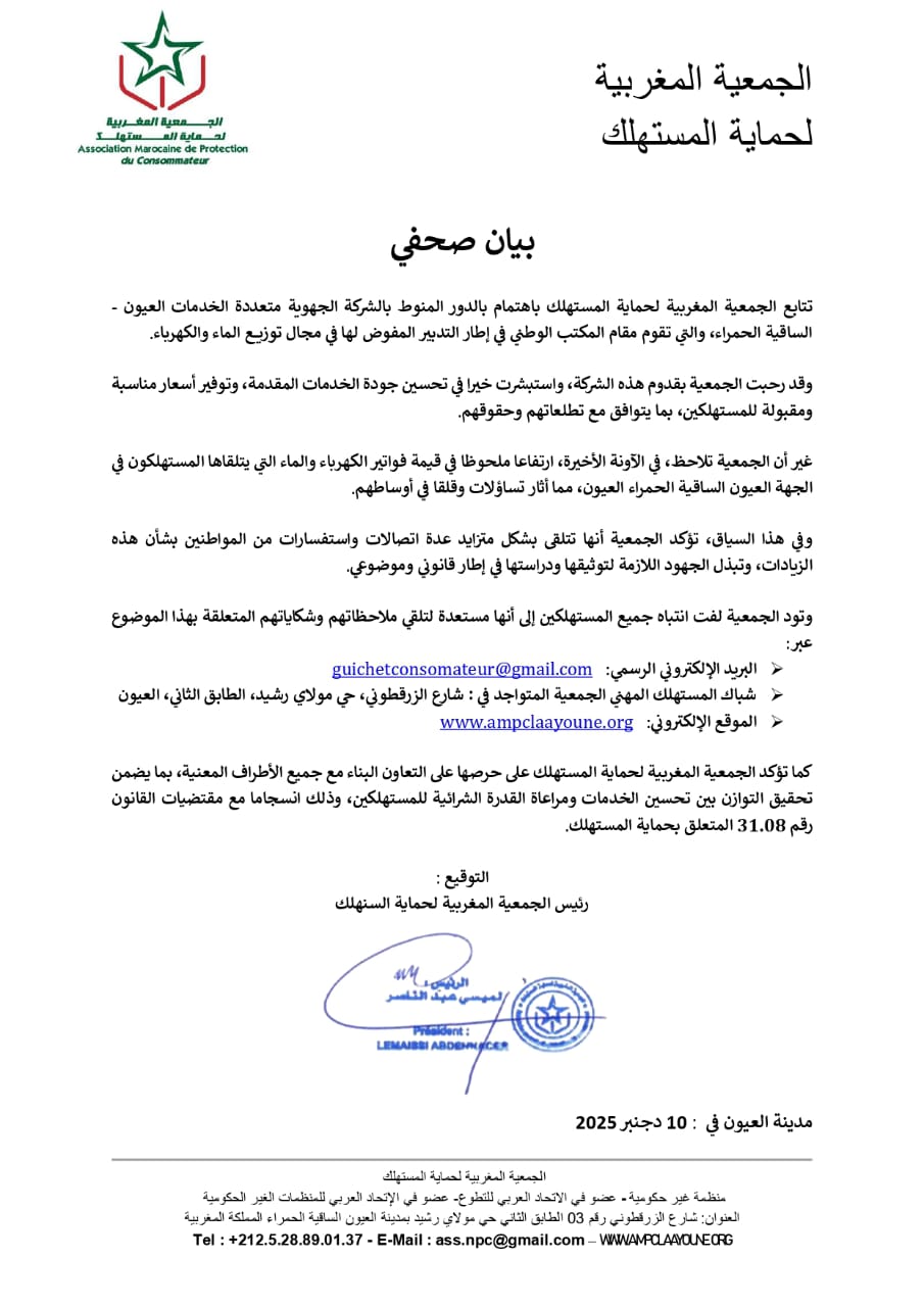 أعلنت الجمعية المغربية لحماية المستهلك عن متابعتها الحثيثة لدور الشّركة الجهوية متعدّدة الخدمات في العيون السّاقية الحمراء، المكلّفة بتوزيع الماء والكهرباء، ضمن إطار التّفويض الممنوح لها من قبل المكتب الوطني.
