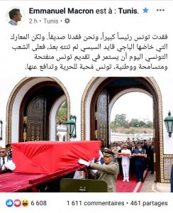 ودوّنَ “إيمانويل ماكرون” على حسابه بموقع التّواصُل “فايسبوك”، حيثُ أثنى بالمجهودات التي بذلها الرّئيس التّونسي الرّاحل، كما وصفهُ بأنّهُ “رئيس كبير”، قائلا : “فقدت تونس رئيساً كبيراً، ونحن فقدنا صديقاً. ولكن المعارك التي خاضها الباجي قايد السبسي لم تنتهِ بعدُ، فعلى الشعب التونسي اليوم أن يستمر في تقديم تونس منفتحة ومتسامحة ووطنية، تونس مُحبة للحرية وتدافع عنها.