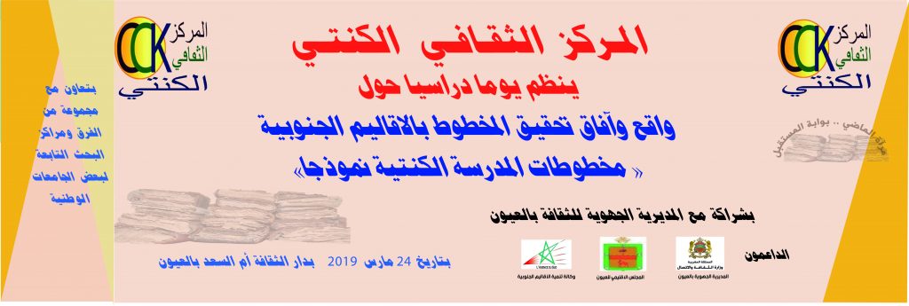 يأتي ذلك، موازاةً مع ما تشهدُهُ السّاحة الثّقافية بالصّحراء، حيثُ يُنظّمُ المركز الثّقافي “الكنتي”، يوماً دراسيّاً تكوينيّاً، حول واقع وآفاق تحقييق المخطوطات في الاقاليم الجنوبية للمملكة “مخطوطات المدرسة الكنتية نموذجا” بشراكة مع المندوبية الجهوية للثقافي بـ”العيون”، وبتعاون مع مجموعة من فرق ومراكز البحث والتوثيق التّابعة لبعض الجامعات الوطنيّة، وبمشاركة مُكثّفة من الطّلبة الباحثين القادمين من مُختلف جهات المملكة للمُشاركة في هذا اليوم التّكويني.