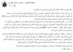 وفي تدوينة له على حسابه على الفيسبوك، قال الدكتور رشيد بنكيران، إن من أكبر أسباب الانتشار للفكر المتطرف الإجرامي (الارهابي!) المؤدلج هو قيام مؤسسات رسمية بالاستهزاء بالدين واحتقار علمائه وكتبه..
