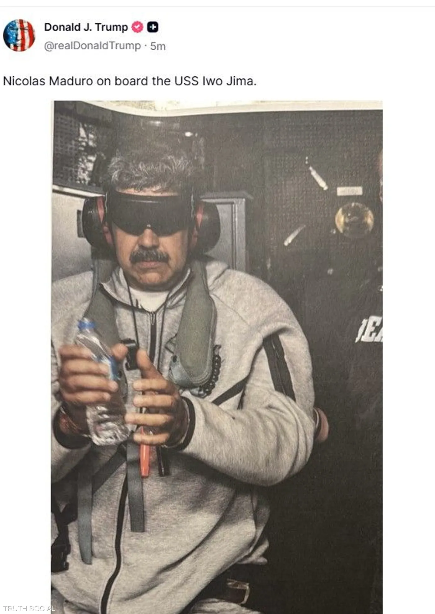 وجاءت الصّورة عبر منصّة “تروث سوشيال”، مصحوبة بتعليق من ترامب أشار فيه إلى أنّ مادورو على متن سفينة يو إس إس إيوا جيما، وظهر الرّئيس الفنزويلي مرتديًا زيًّا رياضيًا رمادي اللّون وسمّاعات عازلة للصّوت.