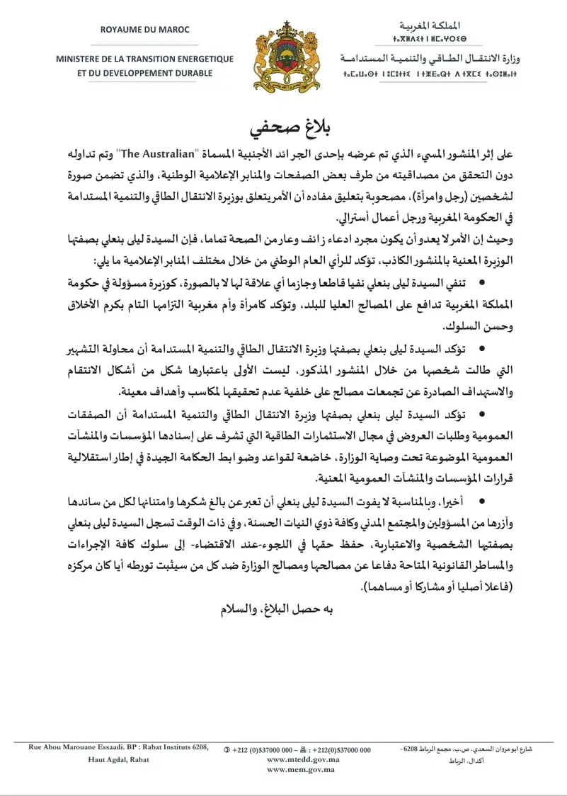 ونفت بنعلي في بلاغ، توصّلت “أخبار تايم” بنسخة منه، اليوم الثلاثاء، أيّ صلة لها بالصّورة التي نشرتها الصّحيفة الأستراليّة “ذو أستراليان”، وهي تزعم أنّها للوزيرة المغربيّة ورجل الأعمال أندرو فوريست، متعهّدة بالّلجوء إلى القضاء.