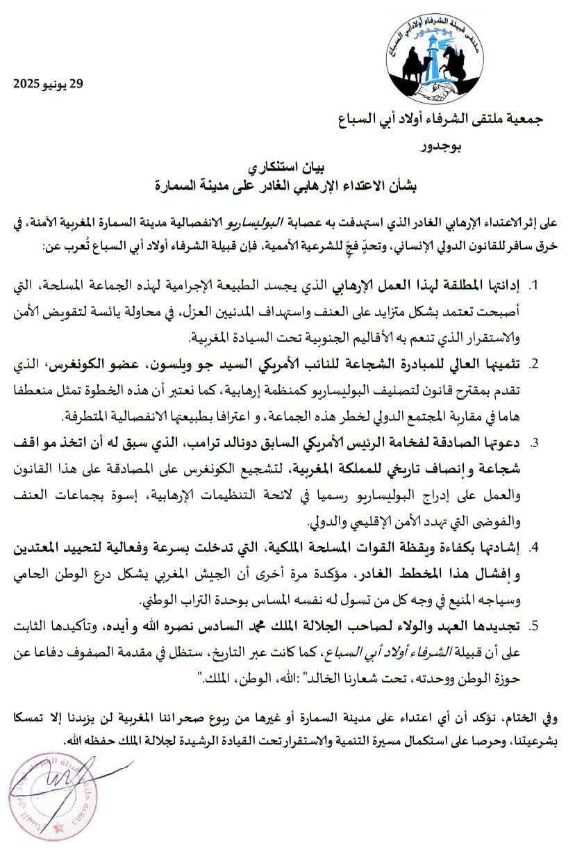 أدانت جمعية ملتقى الشرفاء أولاد أبي السباع، في بيانٍ رسميٍّ صادِرٍ من مقرّها بمدينة بوجدور، الاعتداء الإرهابي الغادر الذي استهدف مدينة السمارة، واعتبرته عملًا إجراميًّا يضرب في صميم أمن واستقرار الأقاليم الجنوبيّة للمملكة، ويخرق بشكل صارخ القانون الدّولي الإنساني.