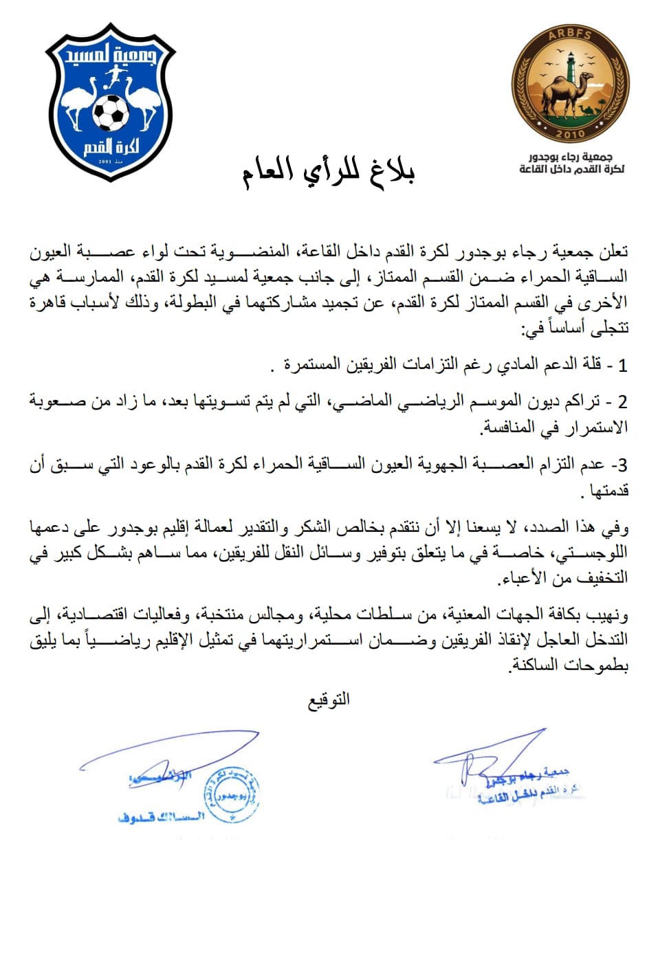 واختُتم البلاغ بنداء إلى جميع الجهات المعنيّة، من سلطات محلّية ومنتخبة وفاعلين اقتصاديين، للتّدخّل العاجل من أجل إنقاذ الجمعيّتيْن وضمان استمرارهما في تمثيل إقليم بوجدور في المنافسات الرّياضية، بما يتماشى مع تطلّعات السكّان.