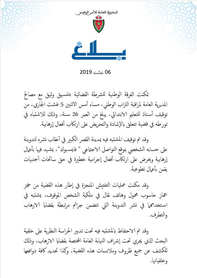 أوقفت الفرقة الوطنية للشرطة القضائية بتنسيق مع المديرية العامة لمراقبة التراب الوطني، مساء الاثنين، أستاذا للتعليم الابتدائي(26سنة) بمدينة القصر الكبير، بعد نشره لتدوينة يشيد فيها بأعمال إرهابية ويحرض على ارتكاب جرائم خطيرة في حق سائحات أجنبيات.