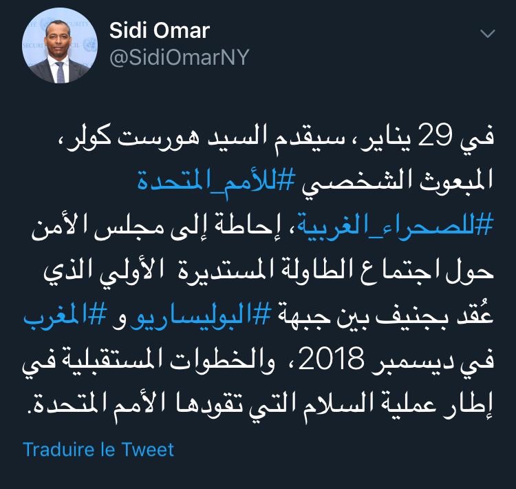 أحد ممثّلي جبهة “البوليساريو” لدى الأمم المتّحدة، “سيدي عمار”، كشف في تدوينة لهُ عبر صفحته بموقع التّواصل الاجتماعي “تويتر”؛ أنّ الوسيط الأممي “كوهلر”، سيُقدّمُ إحاطةً بخصوص أشغال الطّاولة المستديرة المنعقدة يومي الخامس والسّادس من دجنبر الماضي بالعاصمة السويسرية “جنيف”. وأشار أيضاً، إلى أنّ المبعوث الأممي سيعملُ في إطار المساعي والجهود التي تقودها الأمم المتّحدة، على إحاطة المجلس بالخطوات المستقبليّة للعمليّة السّياسية بشأن ملفّ الصّحراء.