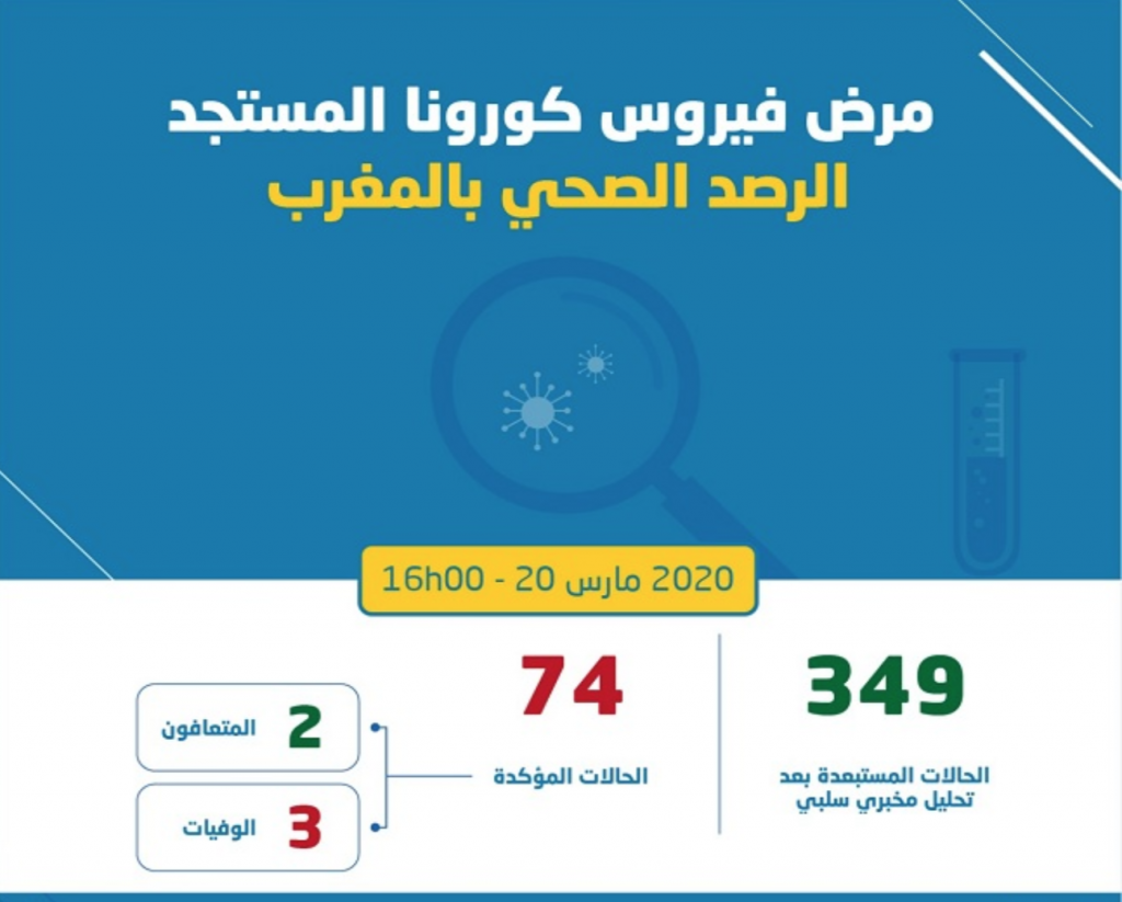 أعلنت وزارة الصحة المغربية، قبل لحظات، في تحديث جديد على بوابة فيروس كورونا (كوفيد -19) بالمغرب، عن ارتفاع تعداد حالات الإصابة المؤكدة بالفيروس في المغرب، إلى 74 حالة، و الوفيات إلى ثلاثة أشخاص.