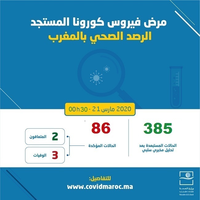 شهدت الساعات الأخيرة من ليلة الجمعة إلى السبت، تسجيل المغرب إصابات جديدة مؤكدة بفيروس “كورونا” (كوفيد 19)، رفعت العدد الإجمالي من الحالات المصابة إلى 86.