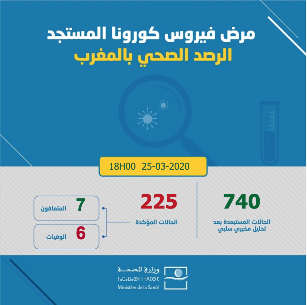 تجاوزت حالات الإصابة المؤكدة بفيروس كورونا المستجد (كوفيد 19) اليوم الأربعاء، حاجز المائتين شخص، بعد تسجيل 55 حالة إصابة جديدة و مؤكدة دفعة واحدة، ما رفع حصيلة المغرب من الإصابات إلى 225 إلى حدود السادسة من مساء اليوم.