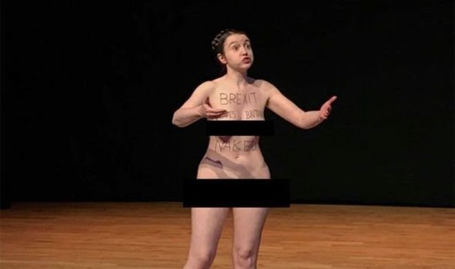إحدى الأكادميّات البريطانيّة التي تُعارض خروج “بريطانيا” من الإتّحاد الأوروبّي، المعروف اختصاراً بـ”بريكسيت”، الدُّكتورة “فيكتوريا بايتمان”، أقدمت على فعلٍ يُعدُّ السّابق من نوعه في هذا المجال، حيثُ قامت بكتابة عددٍ من الكلمات التي تتعلّق بـ”البريكسيت” على جسدها، قبل أن تخلع ملابسها من أجل كسب المزيد من الإهتمام ولفت الأنظار، بل قامت أيضاً بنشر مقاطع فيديو لمحاضرتها عبر صفتحها على “تويتر”.