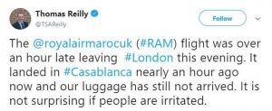 وغرد السفير البريطاني قائلا “لقد تأخر طائرة الخطوط الملكية المغربية عن الإقلاع من لندن هذا المساء، لمدة ساعة، وبعدما حطت قبل ساعة من الآن بمدينة الدار البيضاء، لم نتوصل بعد بأمتعتنا لا تستغربوا انتاب الركاب الغضب”.