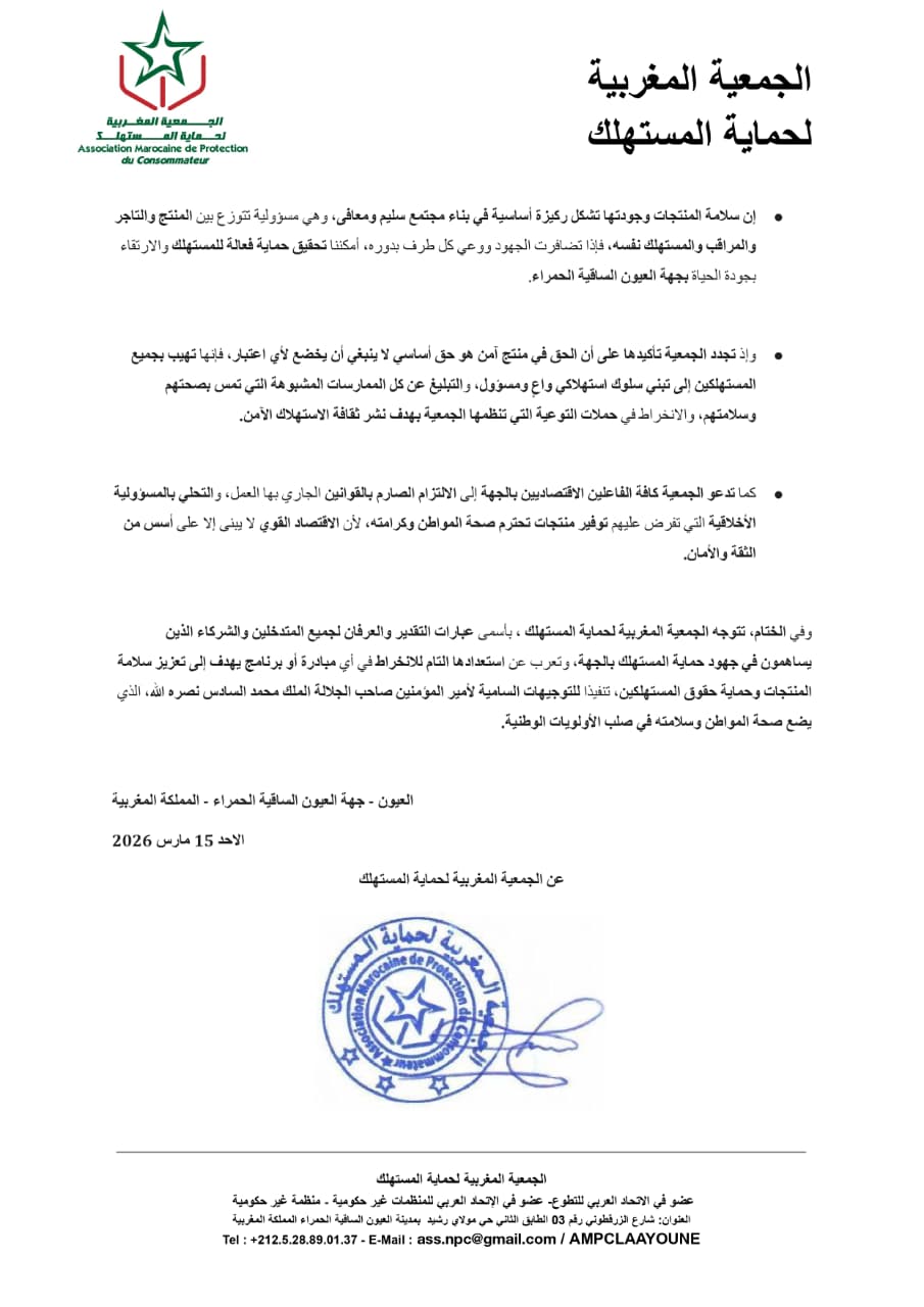 وفي ختام بيانها، جدّدت الجمعيّة المغربية لحماية المستهلك تقديرها لكل الجهات والمؤسّسات التي تسهم في تعزيز حماية المستهلك، مؤكّدةً استعدادها لمواصلة الانخراط في المبادرات والبرامج الهادفة إلى نشر ثقافة الاستهلاك الآمن وترسيخ حماية حقوق المستهلك، تنفيذًا للتّوجيهات السّامية لصاحب الجلالة الملك محمد السادس، التي تجعل صحّة المواطن وسلامته ضمن أولويّات العمل الوطني.