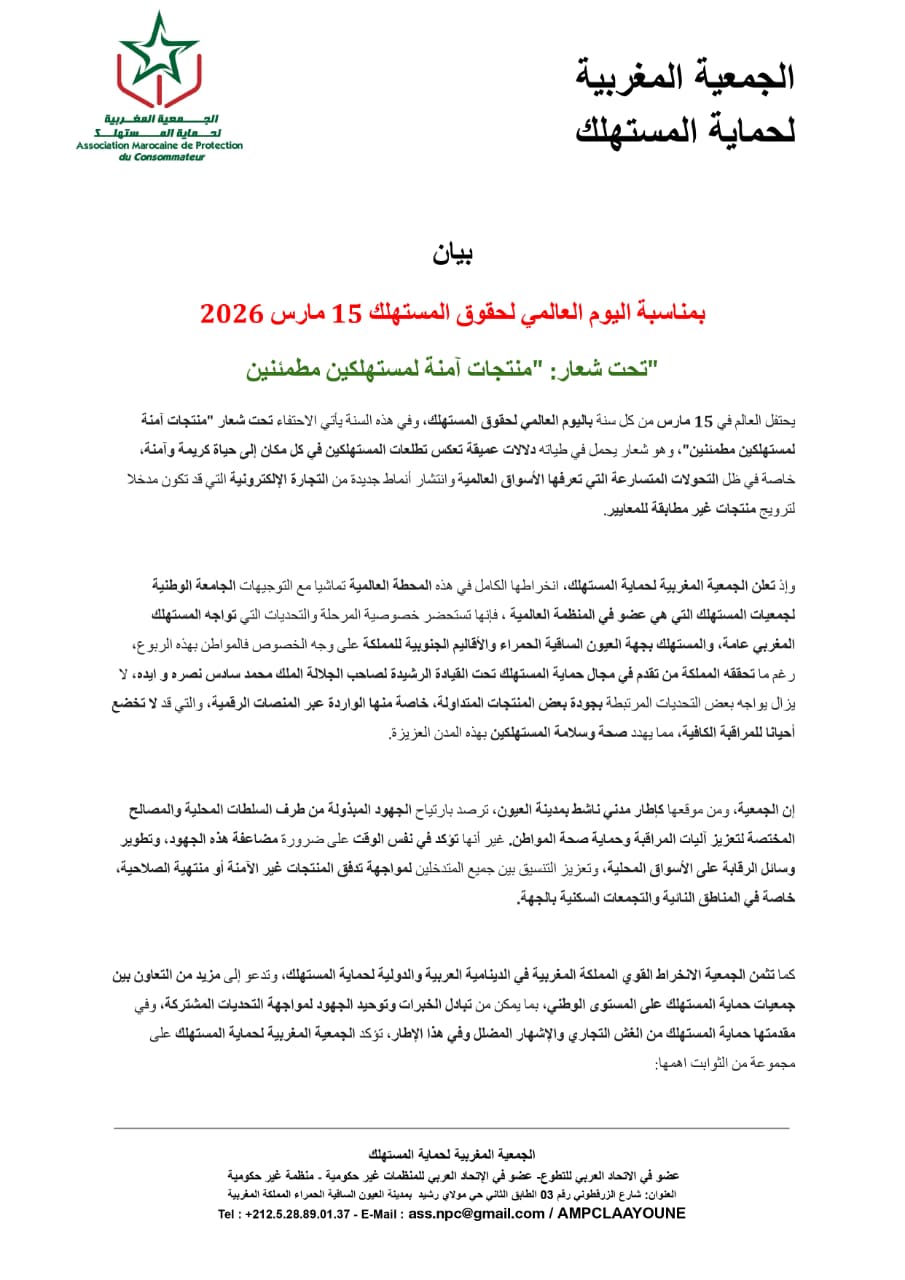 دعت الجمعيّة المغربية لحماية المستهلك إلى تعزيز الجهود الرّامية إلى ضمان سلامة المنتجات المتداولة في الأسواق، وذلك بمناسبة إحياء اليوم العالمي لحقوق المستهلك الموافق لـ15 مارس 2026، والذي يُحتفى به هذه السّنة تحت شعار: “منتجات آمنة لمستهلكين مطمئنّين”.