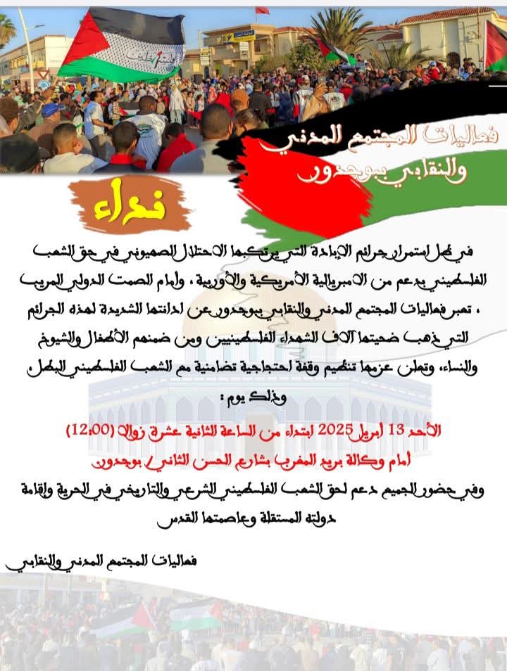 شهد شارع الحسن الثاني بمدينة بوجدور، زوال اليوم الأحد 13 أبريل، وقفة احتجاجيّة حاشدة نظّمتها فعّاليات مدنيّة ونقابيّة، للتّعبير عن تضامنها المطلق مع الشّعب الفلسطيني في مواجهة العدوان الإسرائيلي المتواصل على قطاع غزّة وباقي الأراضي الفلسطينيّة المحتلّة.