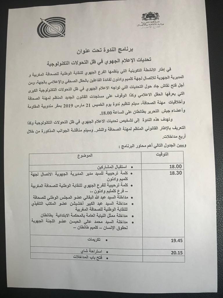 وعياً منه بما يعانيه الجسم الصّحافي بـ”المغرب”، في ظل التطوُّر التّكنولوجي وانتشار مواقع التّواصل الإجتماعي، وكذا اِيمانه بالرّسالة النّبيلة للعمل الإعلامي، في اِطار التّواصل والتّوعية، نظّم المكتب الجهوي للنّقابة الوطنيّة للصّحافة المغربيّة، والمندوبية الجهويّة للإتّصال بجهة “كليميم وادنون”، ندوة حول “تحديات الاعلام الجهوي في ظل التحولات التكنولوجيا”، أقيمة بفضاء المقاومة بمدينة “الطنطان”.
