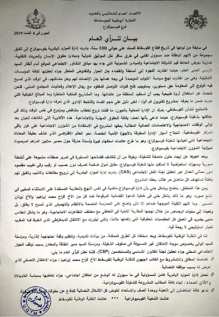 إلى ذلك سجل ذات البيان، ما أسماه بـ”الصفقات المشبوهة” على “أنشطة صورية” من سهرات و إستعراضات لا تفيد الشغيلة في شيء، معتبراً أن الأمر يتعلق بثروة طبيعية يجب أن تستفيد منها المدينة، وما تعثر المشاريع الملكية و المبالغ الضخمة التي أهدرت خير دليل على الفساد الإداري و التدبيري يضيف ذات البيان.